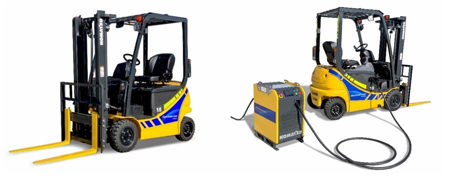 これまでコマツは、電動式フォークリフトにおいて、通常のバッテリー搭載機種に加え、補水不要な鉛バッテリーを搭載した機種(※1)や、長時間・重負荷作業向けにリチウムイオンバッテリーを搭載した機種(※2)を提供し、お客さまの現場のニーズにあわせた電動化を進めてきました。一方で、特に低稼働・軽負荷の現場では、イニシャルコストの高さなどからエンジン駆動式フォークリフトを選択されることも多いなど、現場の電動化にはまだ課題があります。