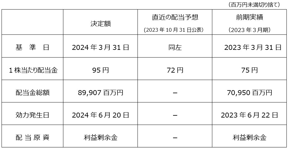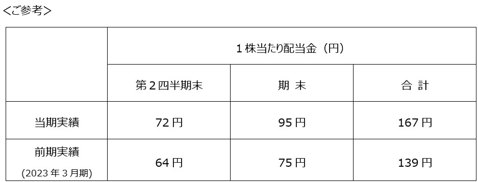 当期の配当金については、上記配当方針の下、当期の業績及び今後の事業展開等を勘案し、期末配当金は、前回の配当予想72円から1株につき23円の増額を予定しています。これにより当期末の配当金は95円となります。当期の年間配当金は、既に実施している第2四半期末の配当とあわせ、1株につき167円となり、前期(2023年3月期)実績から28円増配、連結配当性向は40.1%となります。第155回定時株主総会(本年6月19日に開催予定)に提案する予定です。