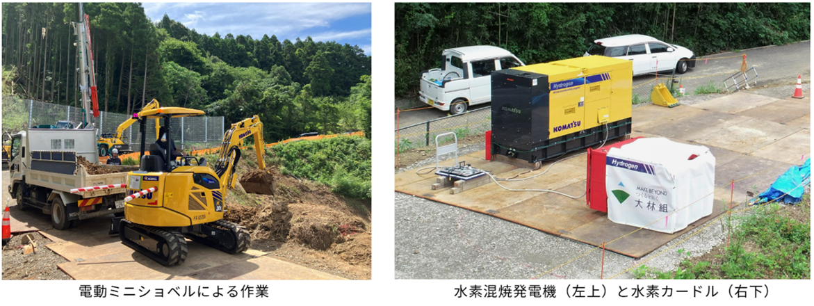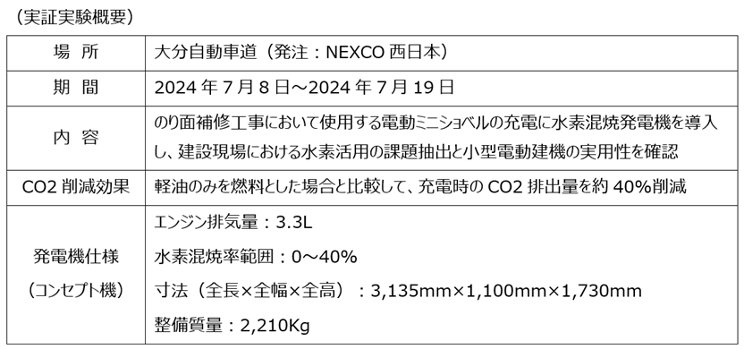 株式会社大林組(本社:東京都港区、社長:蓮輪賢治)は、大分自動車道の、のり面補修工事において、電動ミニショベルの充電用に可搬式の水素混焼発電機を設置し、建設現場での水素活用に関する実証実験をコマツ(株式会社小松製作所、本社:東京都港区、社長:小川啓之)の協力のもとで行いました。