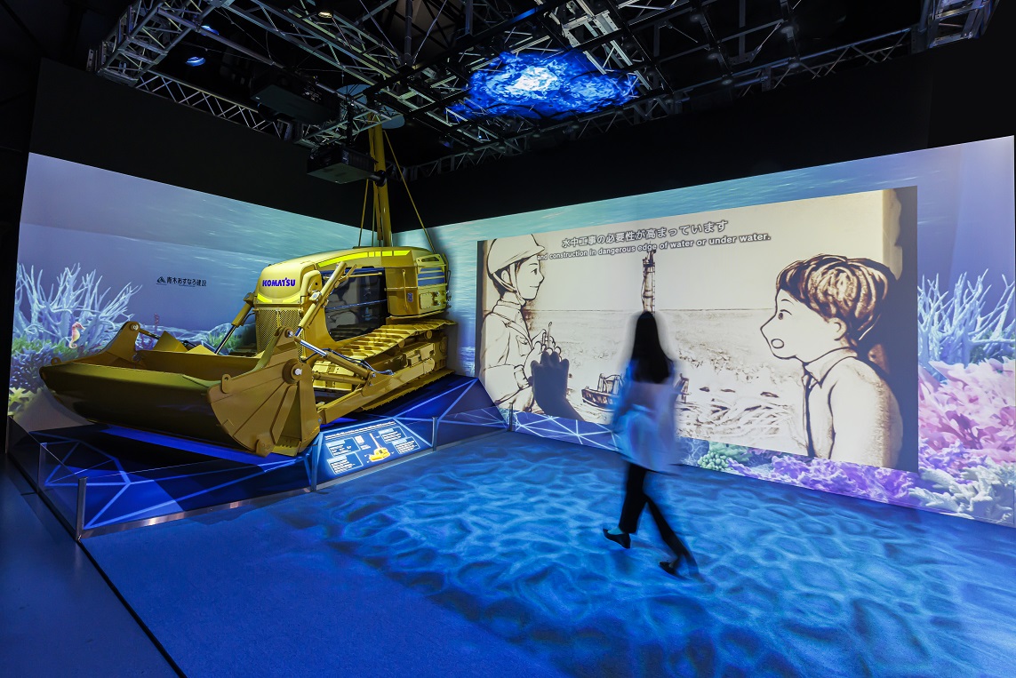 このたび公開した展示プレイスは、『誰もが活躍・命や暮らしを守る「未来の水中工事」』をテーマに、水中施工ロボットのコンセプトマシンを精巧に再現した大型模型とともにサンドアートやCG映像、実写を織り交ぜて水中施工ロボットの活躍を描いた3編のショートムービーなどで「未来の水中工事」を紹介します。また、展示プレイス入口の床に投射した海辺の映像では、来場者の足跡を水中施工ロボットが追いかけるインタラクティブな演出があるほか、頭上の3Dディスプレイで泳ぐ水中生物がメインスクリーンに飛込む水中体験など、リアル感・わくわく感いっぱいの展示をお楽しみ頂けます。