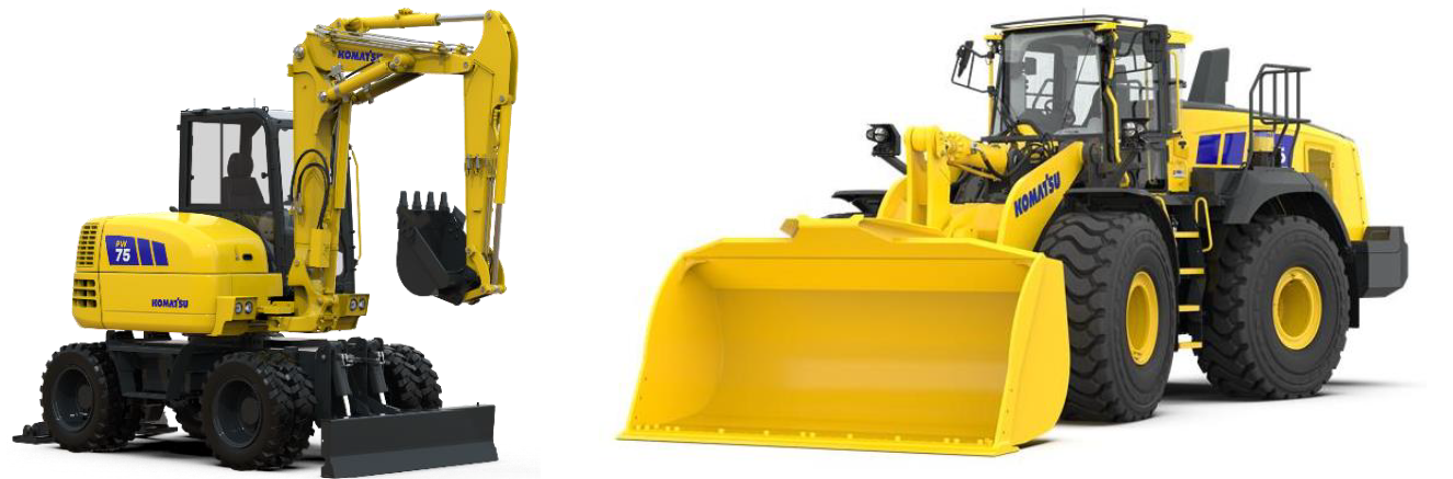 【7.5トンクラスのホイール式油圧ショベル(左)、新世代ホイールローダー WA485-11(右)】