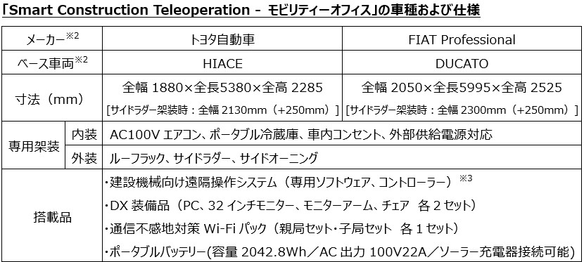 本商品は、カスタマイズされた大型バンに、建設機械向け遠隔操作システム「Smart Construction Teleoperation」のコックピット機能を備えた車両型のモビリティーオフィスです。車両型のため、さまざまな現場へ迅速に移動でき、アクセスが難しい環境で稼働する建設機械でも、モビリティーオフィス内から遠隔で操作することが可能です。また、車両内には、エアコンを装備した快適な作業空間とパソコン、モニター、二人掛けのデスクを搭載しており、移動先でオフィスとして利用できます。ネットワーク環境が不安定な場所では、Wi-Fiを活用したソリューション「通信不感地対策Wi-Fiパック」を利用して安定した通信環境を構築する※1ことが可能です。