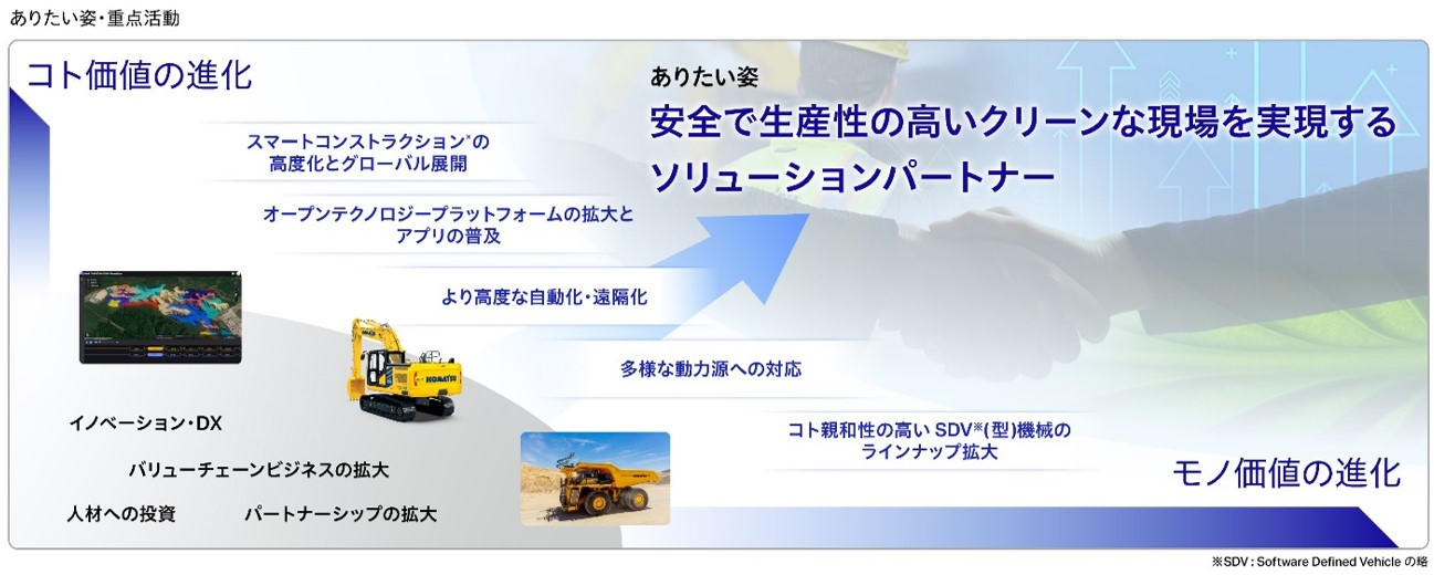 今回、当社が目指すありたい姿を「安全で生産性の高いクリーンな現場を実現するソリューションパートナー」と再定義しました。スマートコンストラクション®やAHS(無人ダンプトラック運行システム)などのソリューションを更に進化させるとともに、それらと連動するより高度な機能を備えた製品の組み合わせにより、お客さまの現場を最適化する新しい価値を提供していきます。