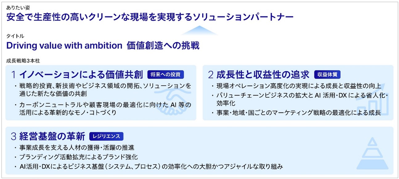 コマツ(社長:今吉琢也)は、新たな3カ年の中期経営計画(2025-2027年度)「Driving value with ambition 価値創造への挑戦」を本年4月よりスタートしました。