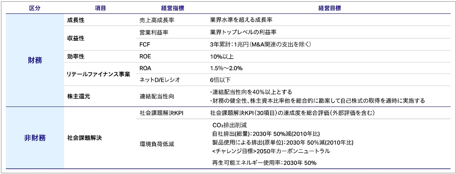 財務項目では、引き続き業界水準を超える成長性、業界トップレベルの収益性を目指します。効率性を示すROE(自己資本利益率)についても、株主資本コストを上回る10%以上を目標として継続します。さらに収益を確保し成長投資を継続していく観点から今回新たにフリー・キャッシュ・フロー(FCF)を加え、3年累計で1兆円という目標を設定しました。また、リテールファイナンス事業におけるD/Eレシオの目標を5倍以下から6倍以下に変更しました。