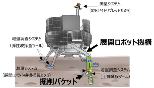 このため本課題では、月面での建設施工や資源開発に必要な高精度の地形データを取得し、レゴリスの土質特性や地層構造を把握するための「測量・地盤調査システム」の開発を目指します。当社はこのうち、地盤調査システム(土質試験ツール)を月面上の調査地点に展開・設置するためのロボット機構を開発します。このロボット機構は、バケットを用いた整地・転圧・掘削などの一連の地盤工事作業を行う機能を備える予定です。これらの作業で取得する、ロボットアームやモーター・減速機にかかる力、画像などのデータは、地盤モデルの高度化や設計・施工システムへの反映に活用され、将来的な月面建設機械の標準化に向けた基盤技術として展開可能です。