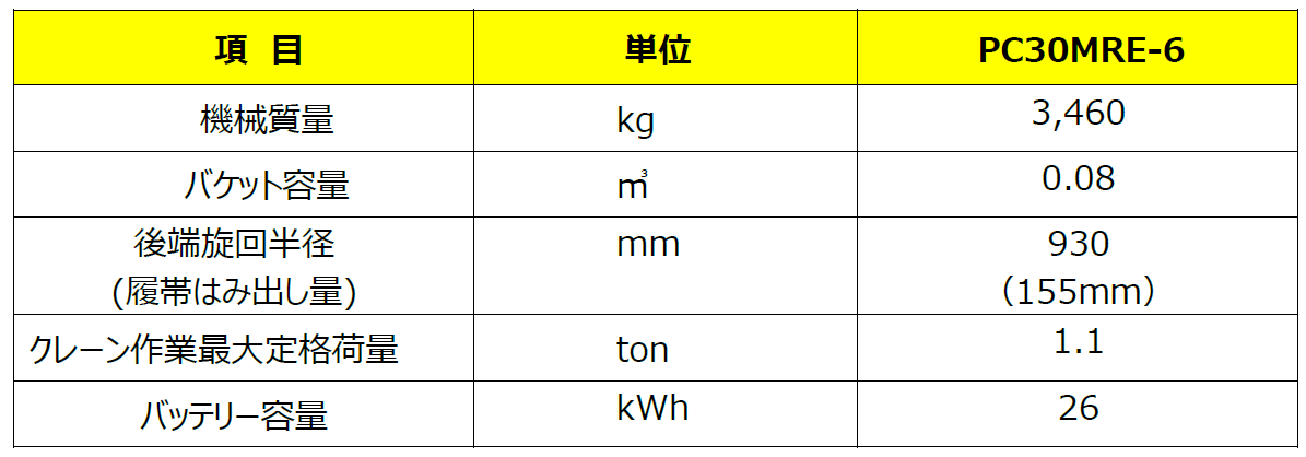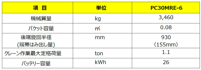 コマツ(社長:今吉琢也)は、このたび、リチウムイオンバッテリーを搭載した後方超小旋回型電動ミニショベルPC30MRE-6(機械質量3,460kg、バケット容量0.08 ㎥)を発売しました。