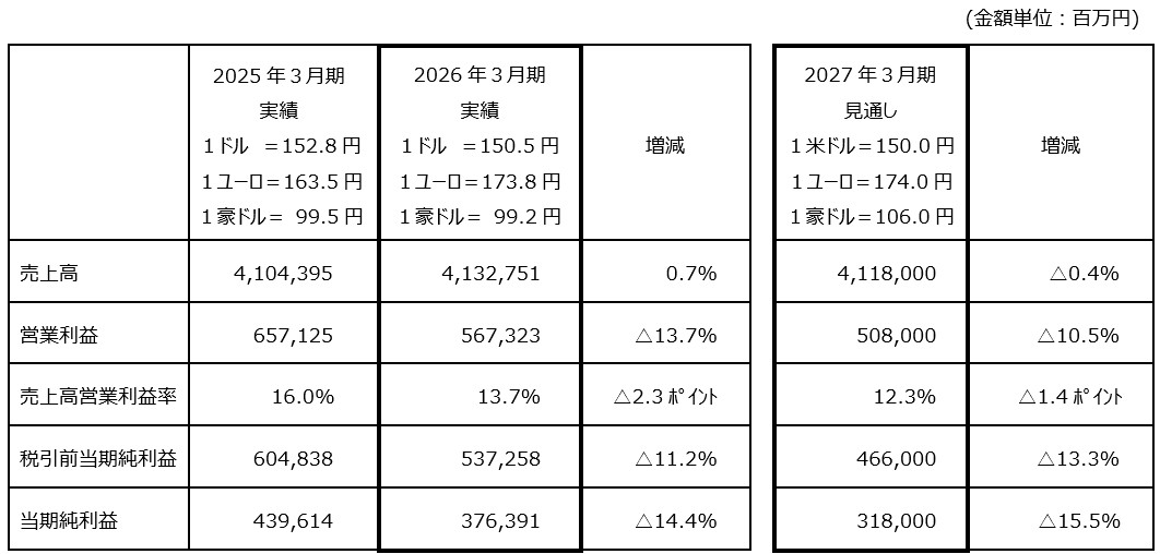 これにより、2027年3月期の連結業績は減収減益となる見通しです。