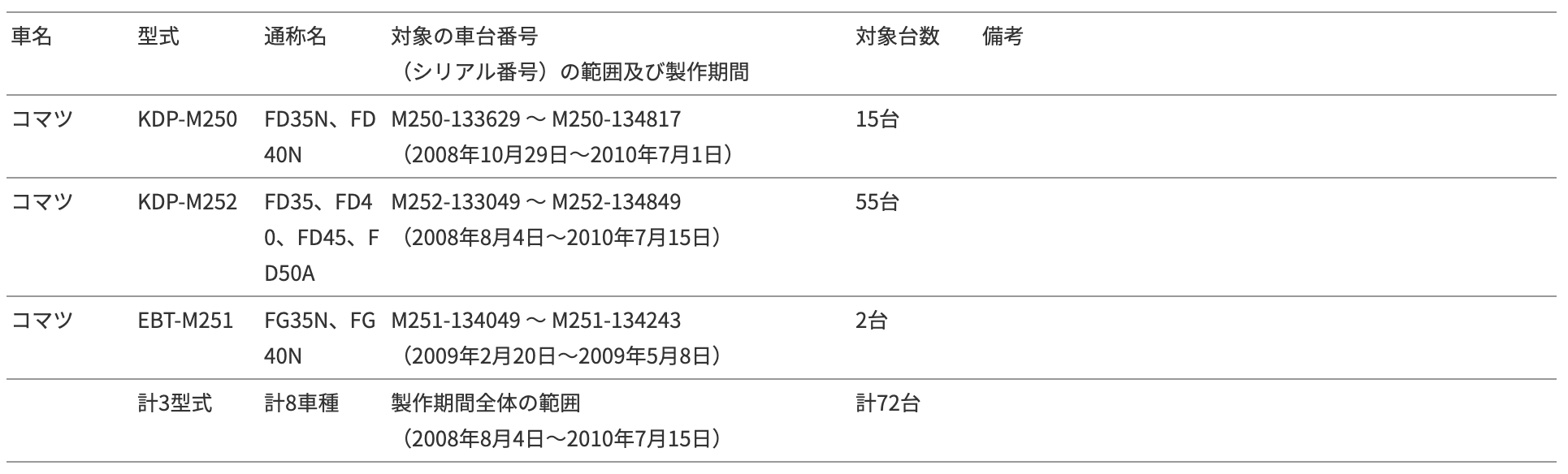 2011年8月11日、コマツは国土交通省に対して、下記のリコール届出書を提出しましたので、お知らせします。 リコール情報