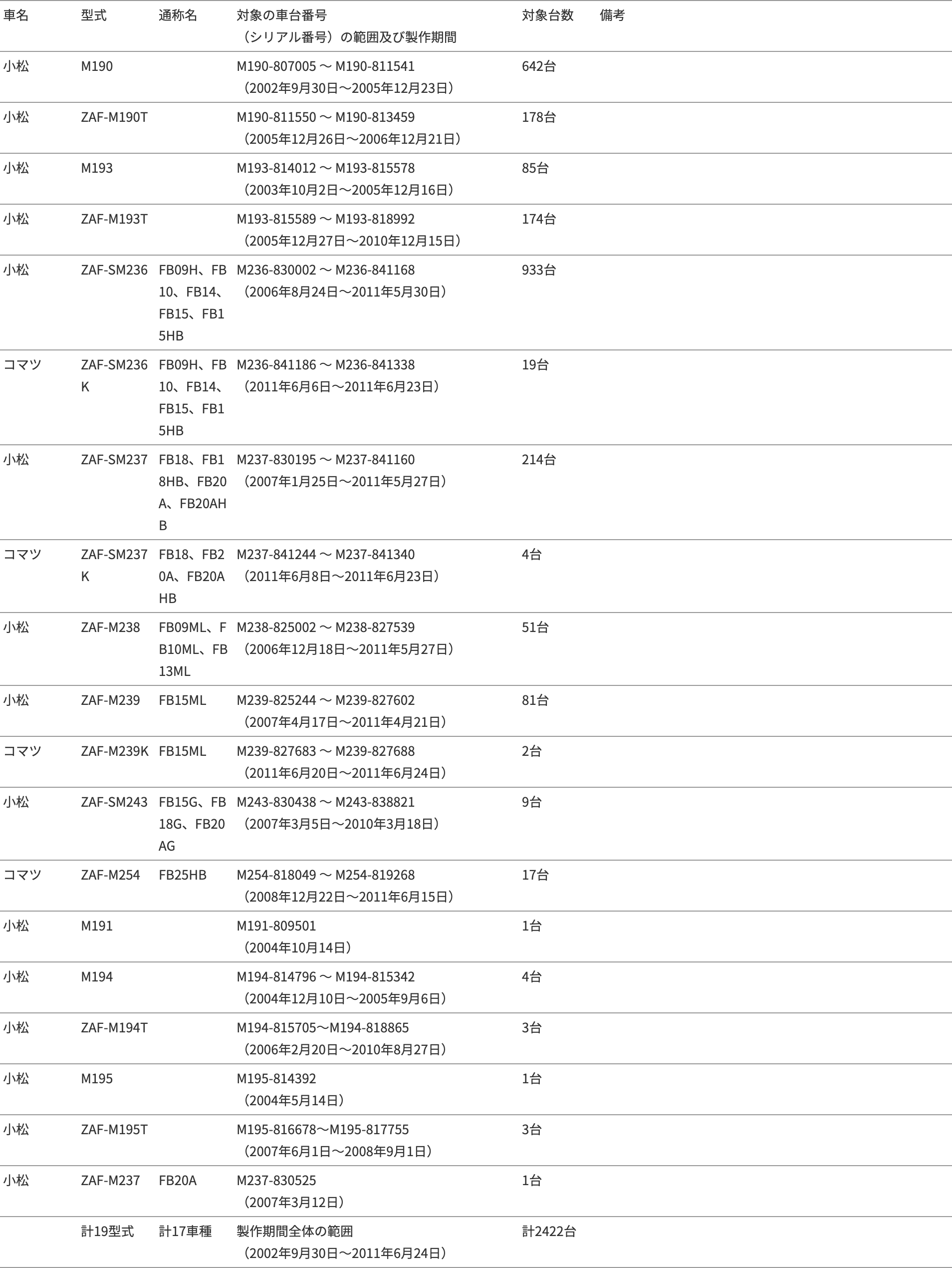 (備考)本届出は、2010年11月9日付け「届出番号2647」にてコマツユーティリティ(株)(2011年4月1日付けで(株)小松製作所に吸収合併)が届出を行ったものであるが、改善措置部品に不具合があったため、再度対策を行うものである。