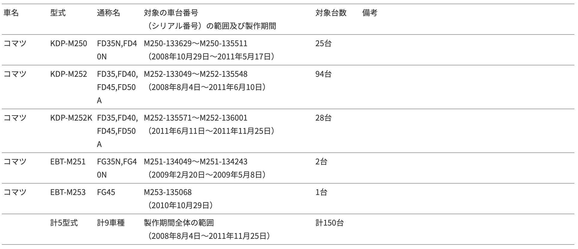 - 対象車の車台番号(シリアル番号)の範囲及び製作期間