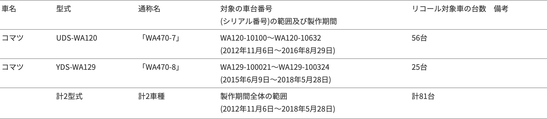 2019年11月8日、コマツは国土交通省に対して、下記のリコール届出書を提出しましたので、お知らせします。