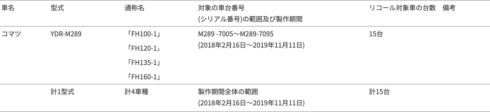 2020年3月13日、コマツは国土交通省に対して、下記のリコール届出書を提出しましたので、お知らせします。