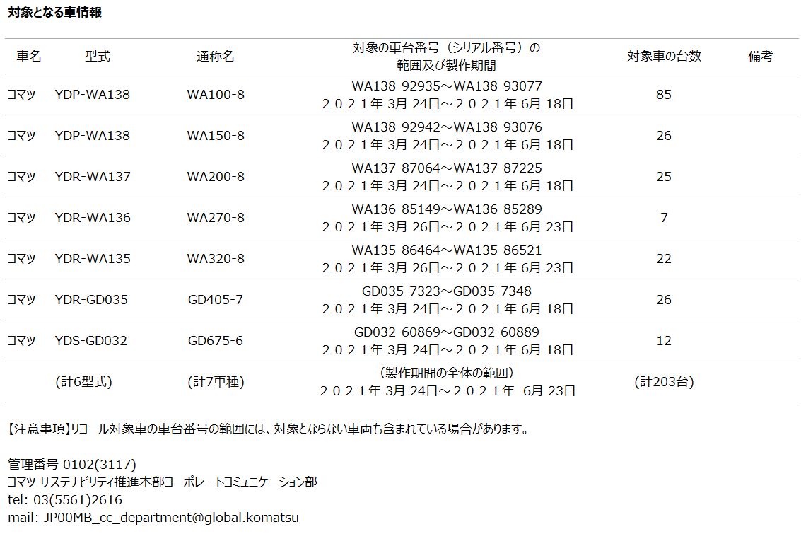 [リコール情報] ショベルローダーとモーターグレーダー制動装置に関するリコール届出について