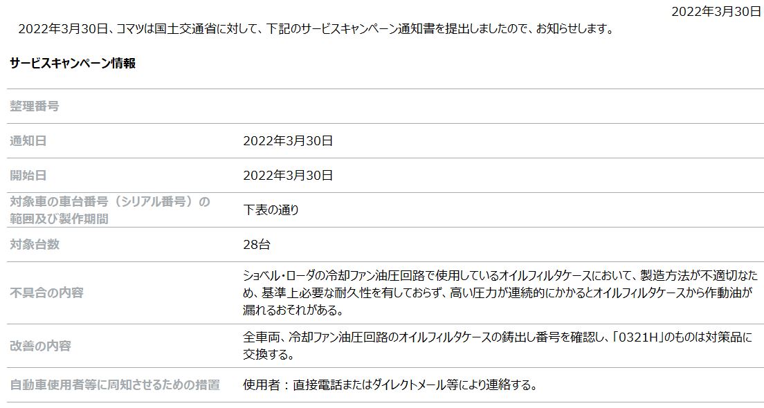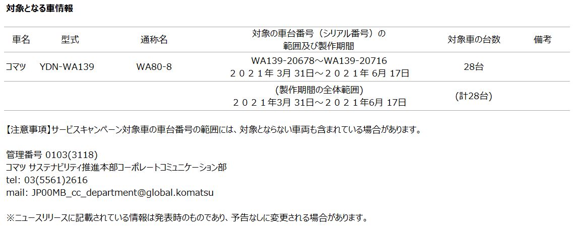 [サービスキャンペーン情報] ショベルローダー「WA80-8」に関するサービスキャンペーンについて
