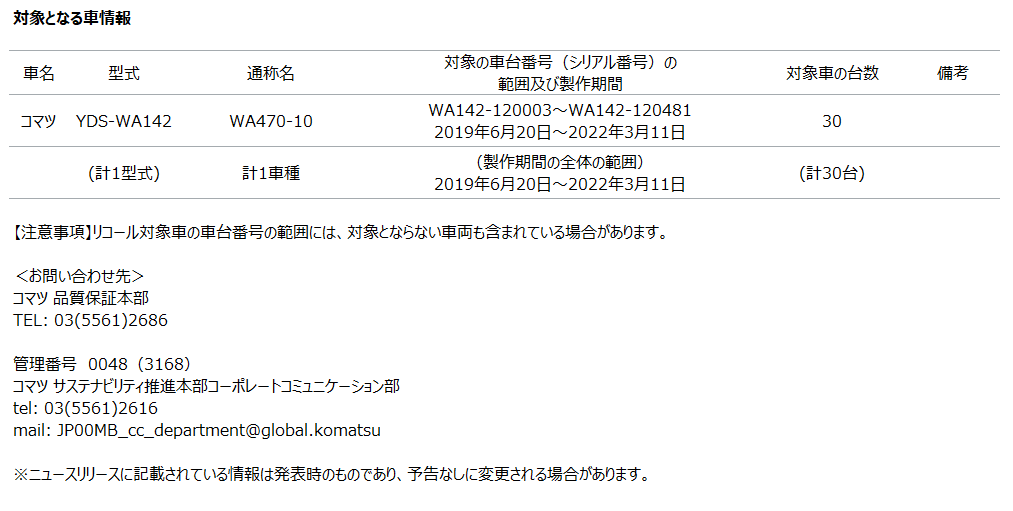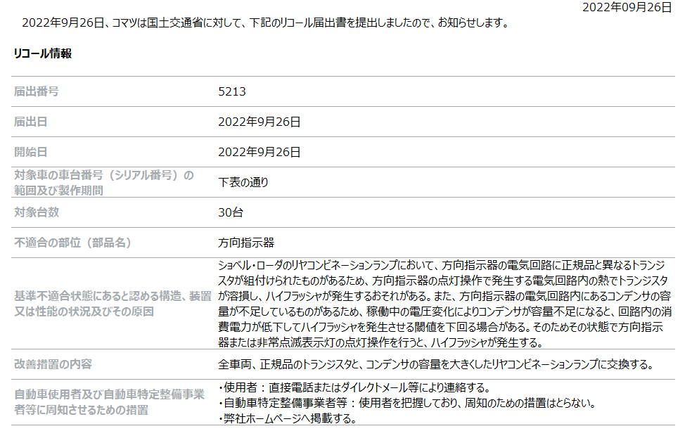 [リコール情報]ショベルローダー「WA470-10」の方向指示器に関するリコールについて