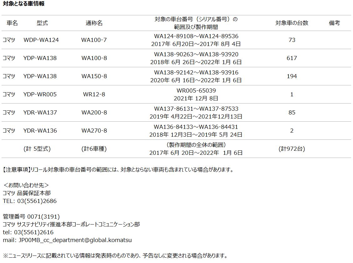 [リコール情報] ショベルローダー「WA100-7、WA100-8、WA150-8、WR12-8、WA200-8、WA270-8」の燃料装置(ヒーター付き燃料フィルタ)に関するリコールについて