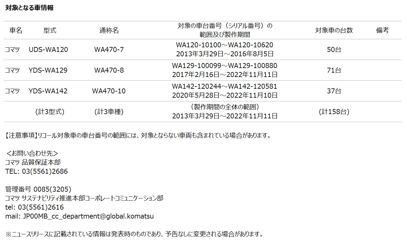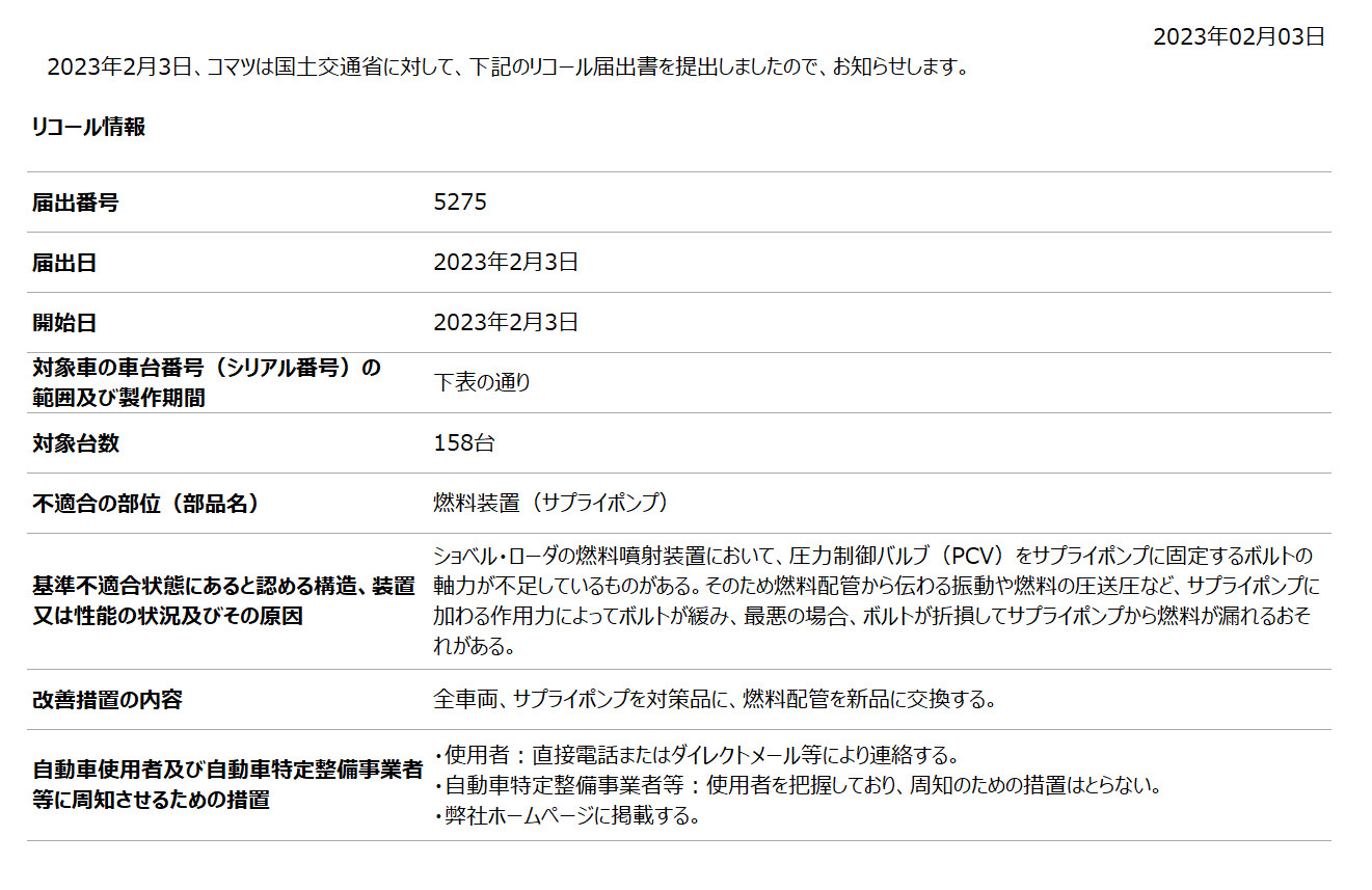 [リコール情報] ショベルローダー「WA470-7、WA470-8、WA470-10」の燃料装置(サプライポンプ)に関するリコール届出について