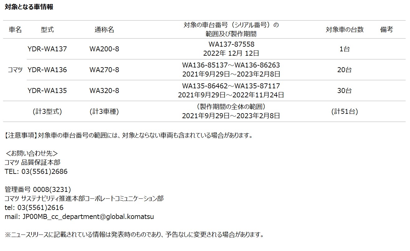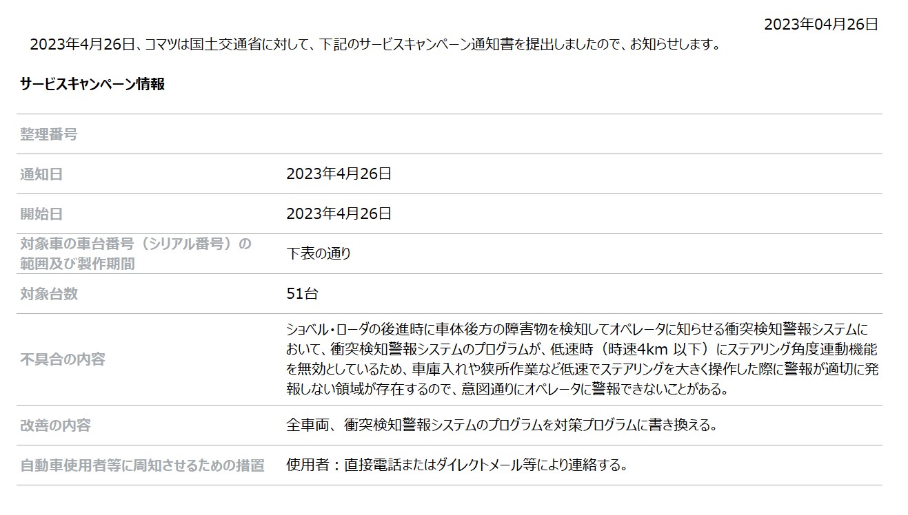 [サービスキャンペーン情報] ショベルローダー「WA200-8、WA270-8、WA320-8」の衝突検知警報システムに関するサービスキャンペーンについて