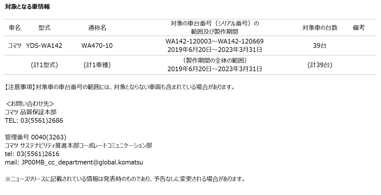 [リコール情報] ショベルローダー「WA470-10」の作業機コントローラーに関するリコール届出について