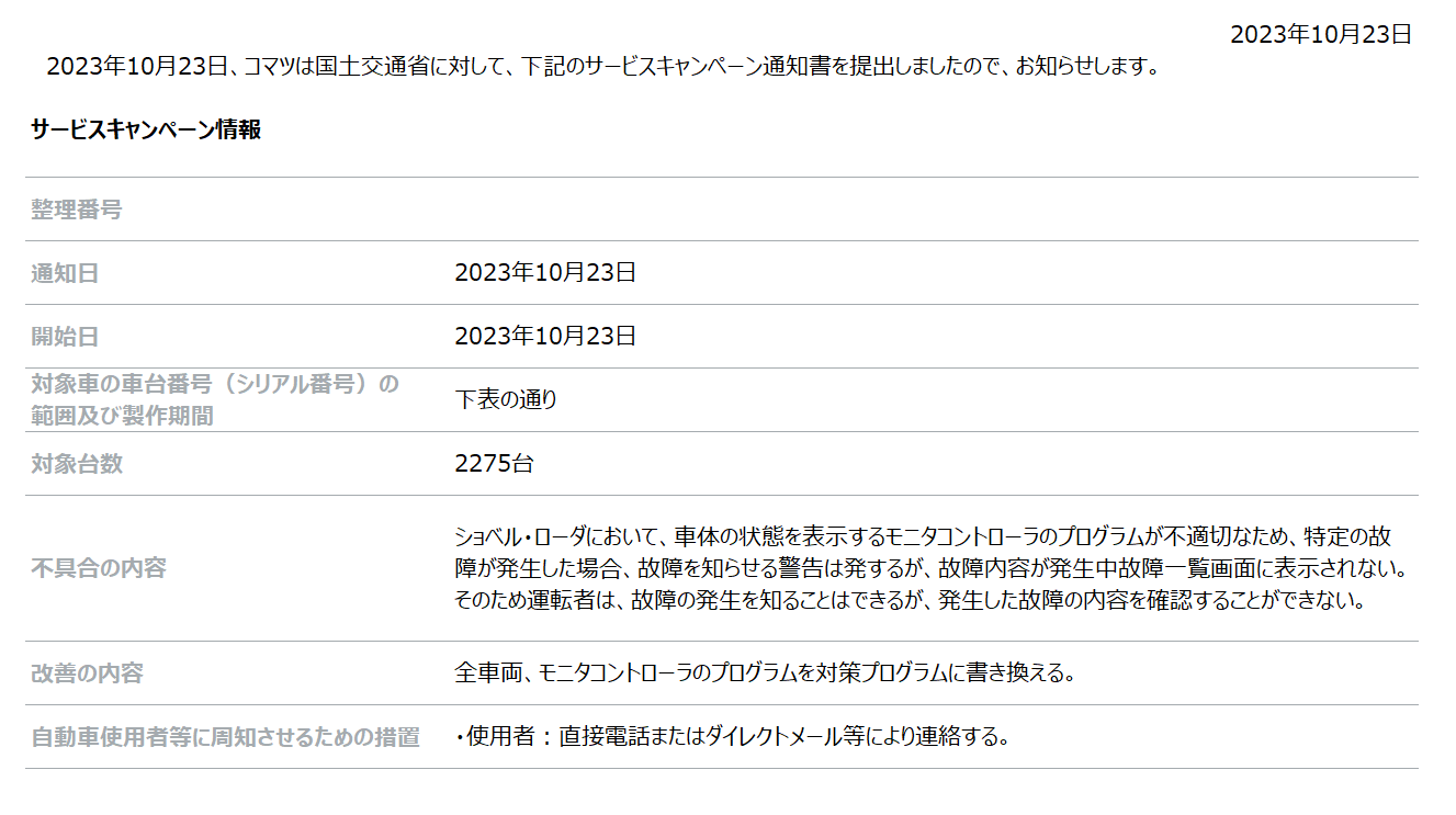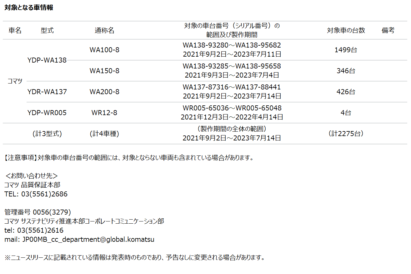 [サービスキャンペーン情報] ショベルローダー「WA100-8、WA150-8、WA200-8、WR12-8」のモニターコントローラーに関するサービスキャンペーンについて