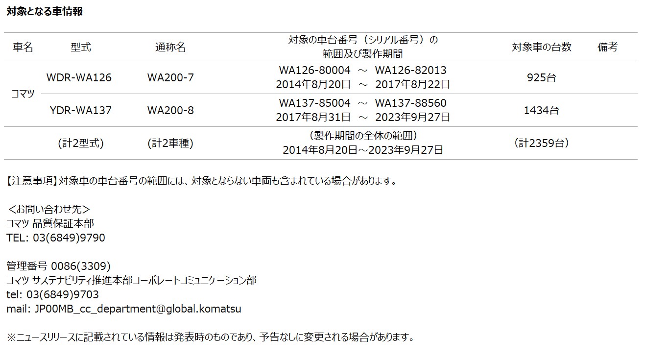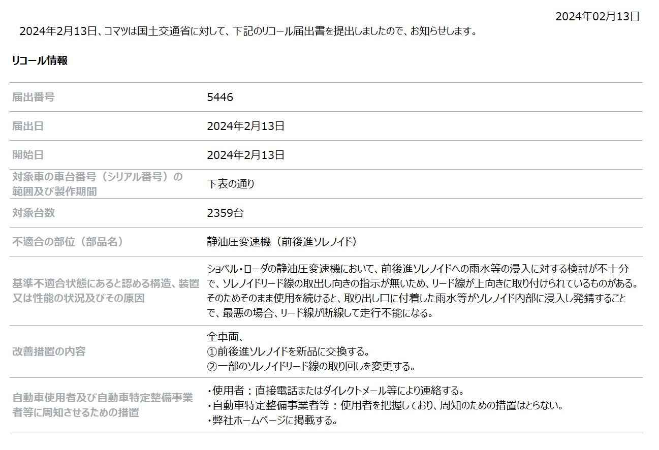 [リコール情報] ショベル・ローダーの静油圧変速機(前後進ソレノイド)に関するリコール届出について