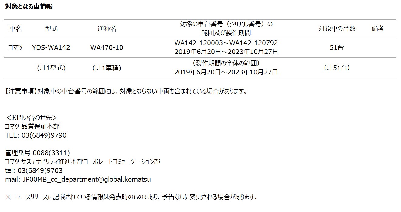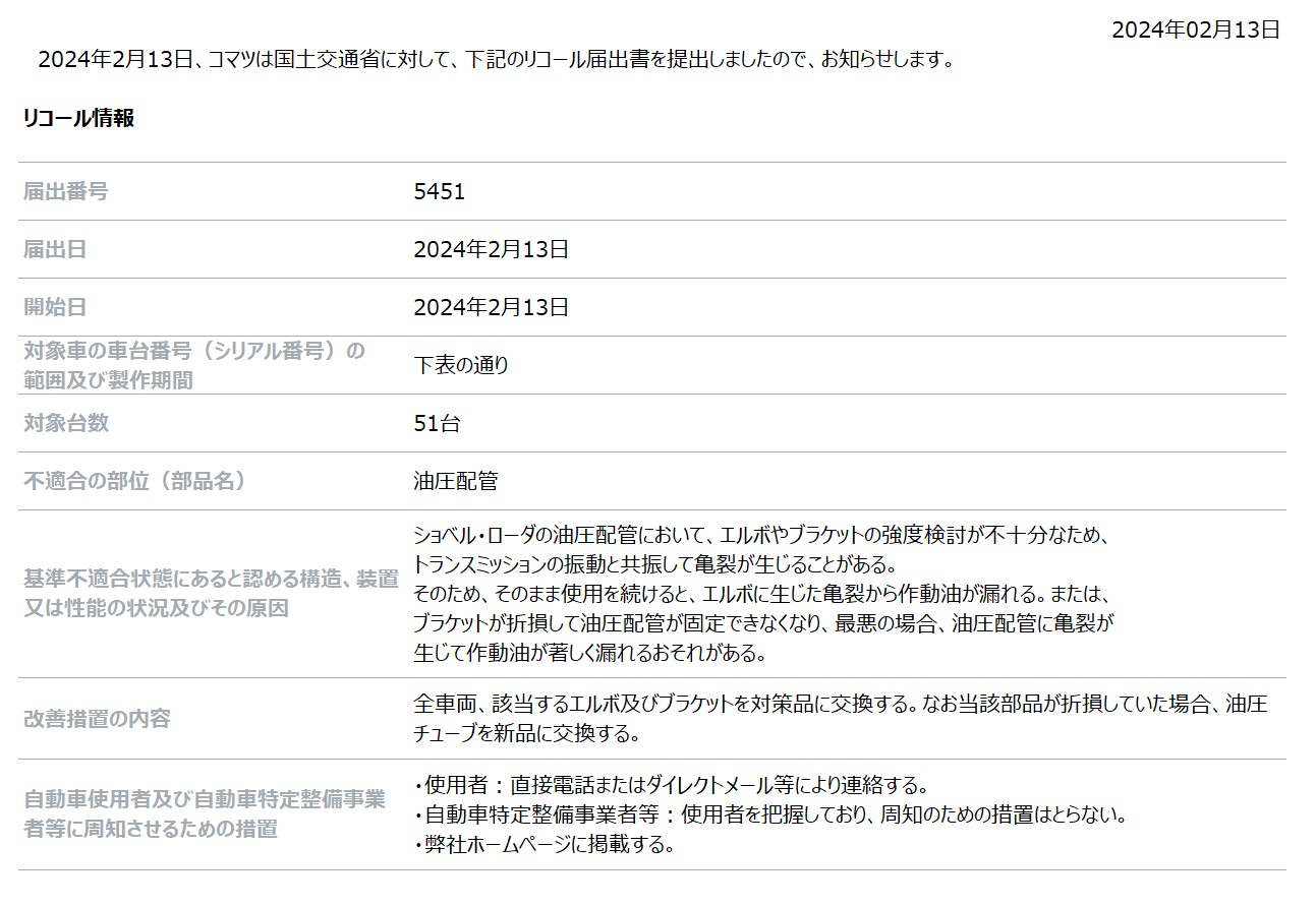 [リコール情報] ショベル・ローダーの油圧配管に関するリコール届出について