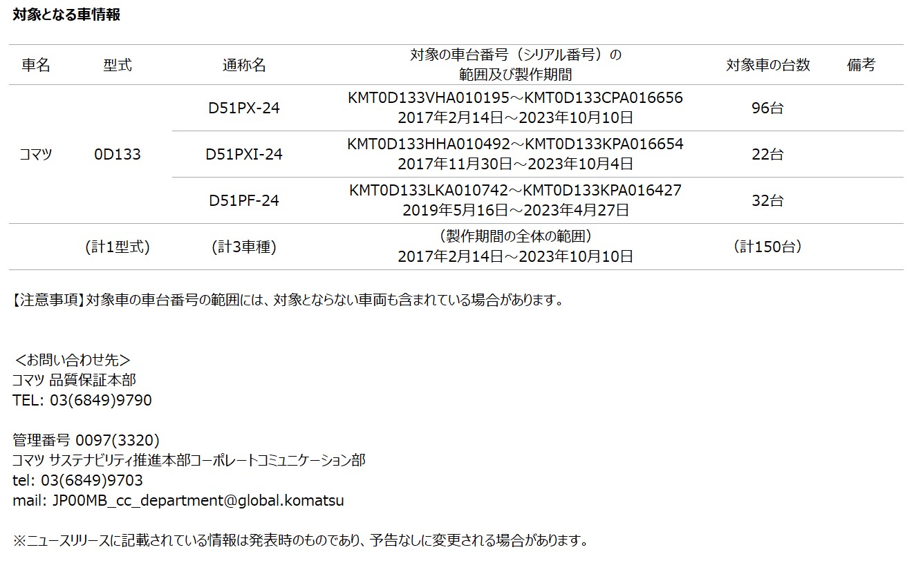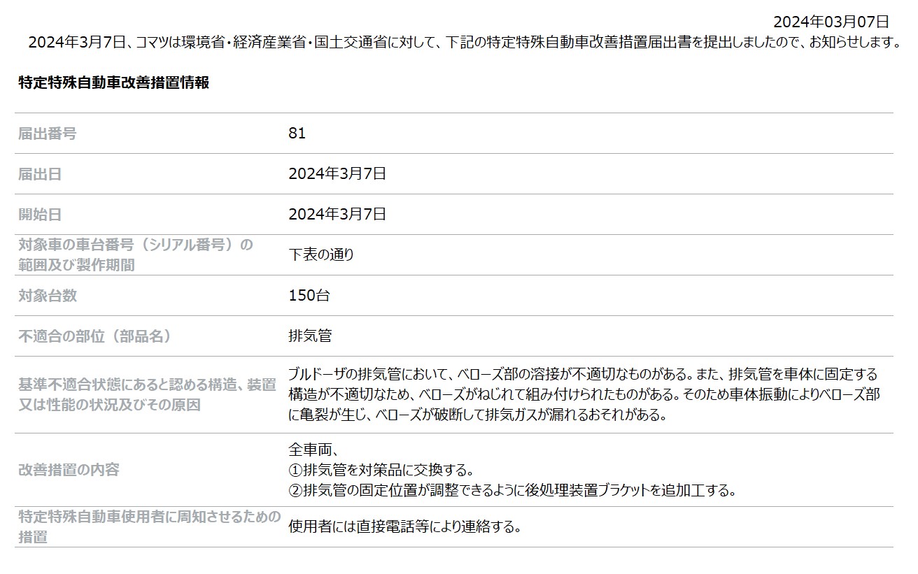 [特定特殊自動車改善措置情報] ブルドーザの排気管に関する特定特殊自動車改善措置について