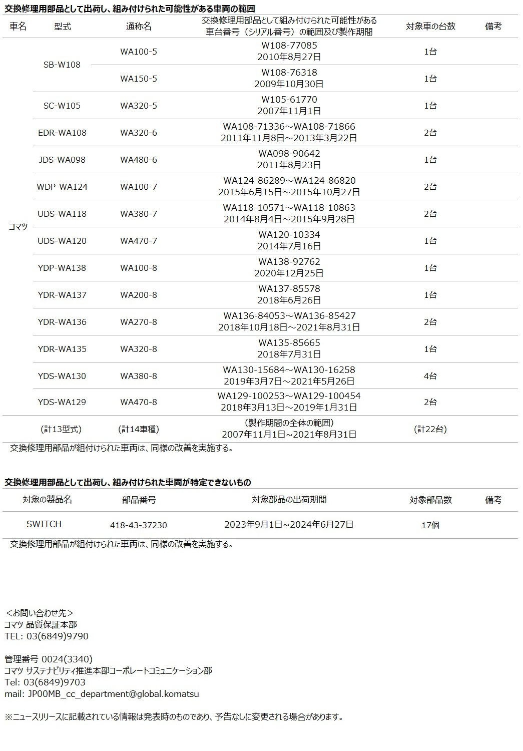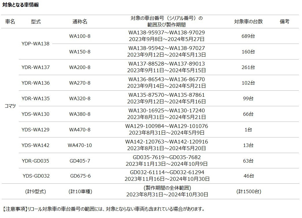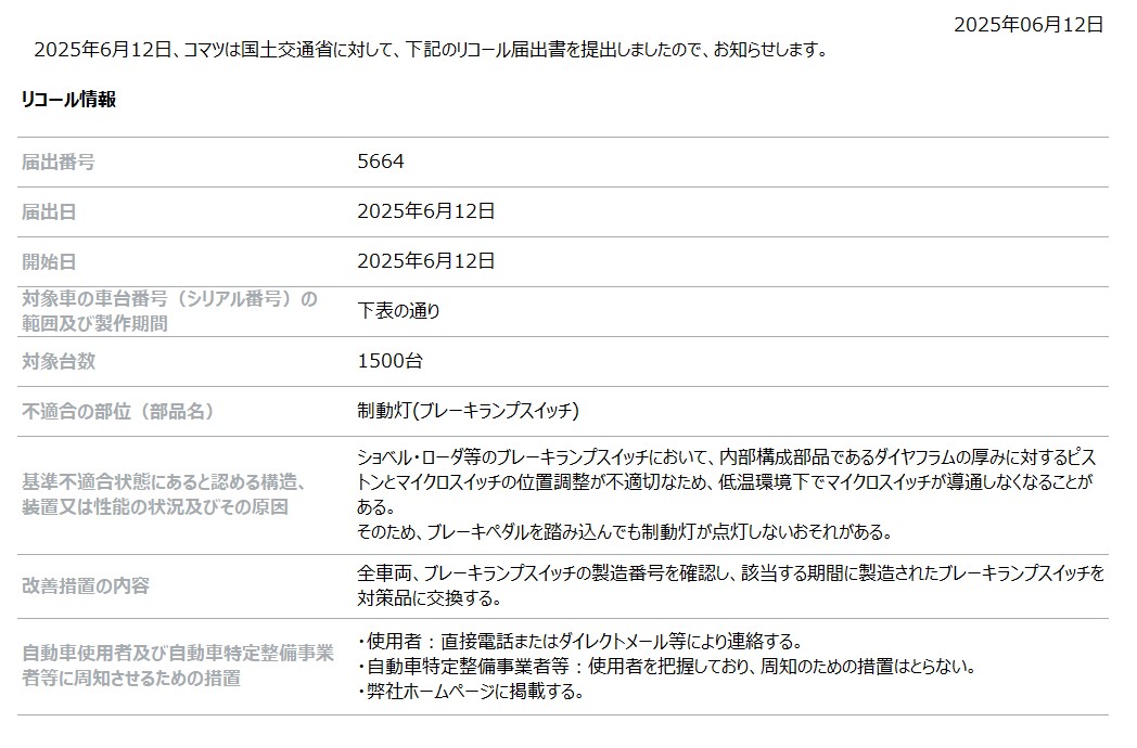 [リコール情報] ショベル・ローダ等の制動灯(ブレーキランプスイッチ)に関するリコール届出について