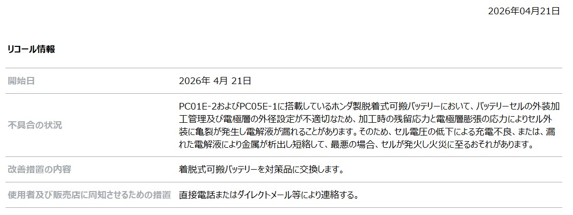 【注意事項】不具合の詳細については、本田技研工業株式会社のホームページを参照ください。
