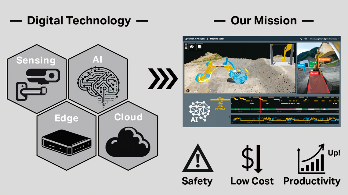 IoT及び統計数理、機械学習、AIなどのデータサイエンス技術を 活用してコマツの建設・鉱山機械から得られるビッグデータを解析 し、ダントツサービス、ダントツソリューションに向けた先行研究に 取り組んでいます。