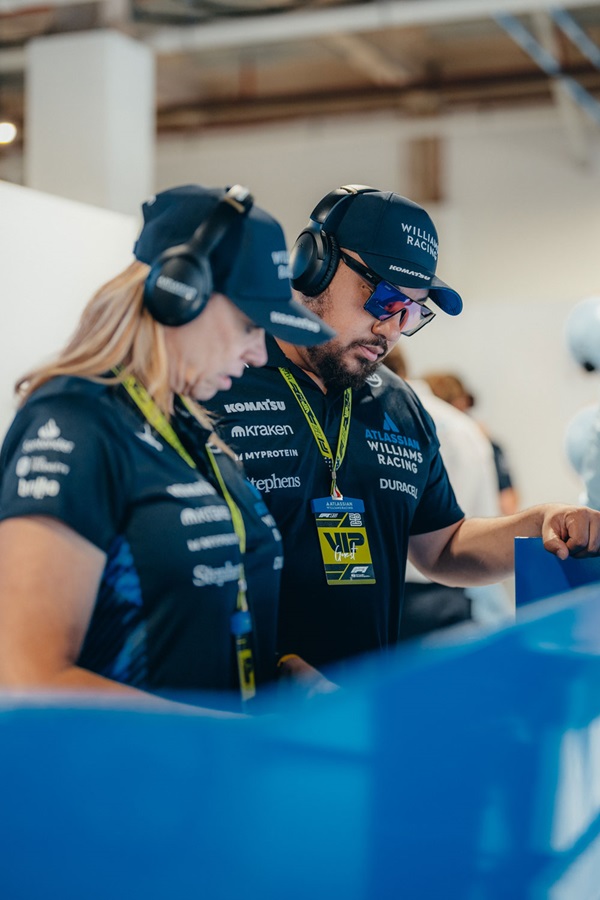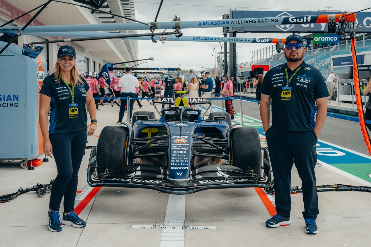 アトラシアン・ウィリアムズ・レーシングのFW47カーのそばに立つ、ナショナルフィールドサービス部門のプロジェクトマネージャー、ジェニファー・イズベルとレベル3フィールドテクニシャンのロイ・ロドリゲス。ロドリゲスはモータースポーツを見て育ち、イズベルはドラッグレースに参加していた経験がありました。「デイ・イン・ザ・ライフ」の週末は彼らにとって、一生に一度の機会として馴染み深い場所に戻ることとなりました。