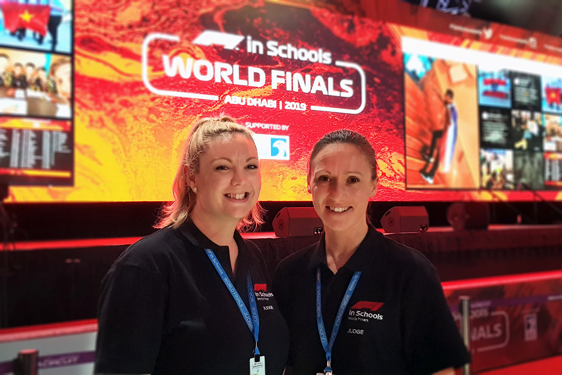 イギリスのバートリーにある英国コマツで働くエンジニアのジェーン・ホジソンさんとキャサリン・マリンズさんは、2019年にF1 in Schools世界決勝大会の審査員としてアブダビへ赴きました。このイベントには、グランプリレースが開催されるヤス・マリーナサーキットでの活動も含まれていました。