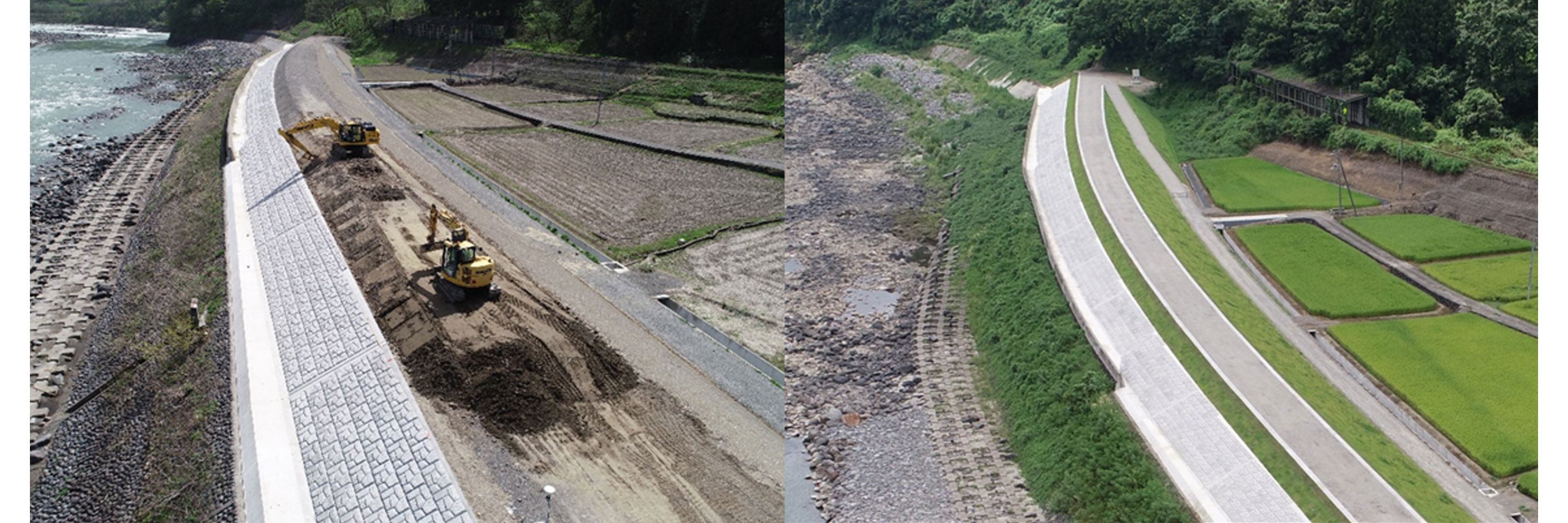 【施工数量】範囲:築堤工L 380m ブロック張工A 2,100m 土量:盛土12,000m³