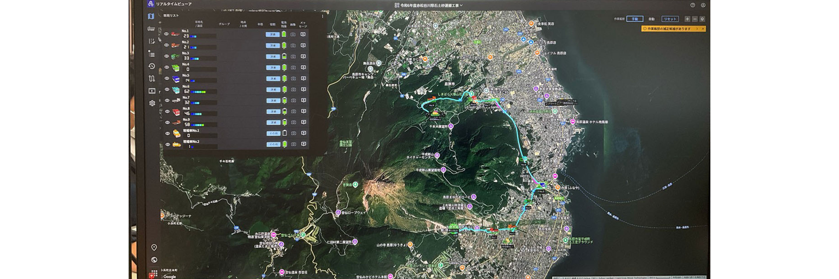 現場内にはダンプトラックがすれ違えない場所があり、接触リスク回避やスムーズな運行を目指して、走行中のダンプトラックをリアルタイムで見られるシステムを探していました。他社に1日走った後の経路を確認できるソフトはありましたが、あくまでもリアルタイムに見られることを重視したのと、土捨て場が2箇所あり経路上に特別支援学校や踏切があったため、安全確保のため設定範囲内に進入するとアラートで知らせる機能もあるSmart Construction Fleetの導入を決めました。