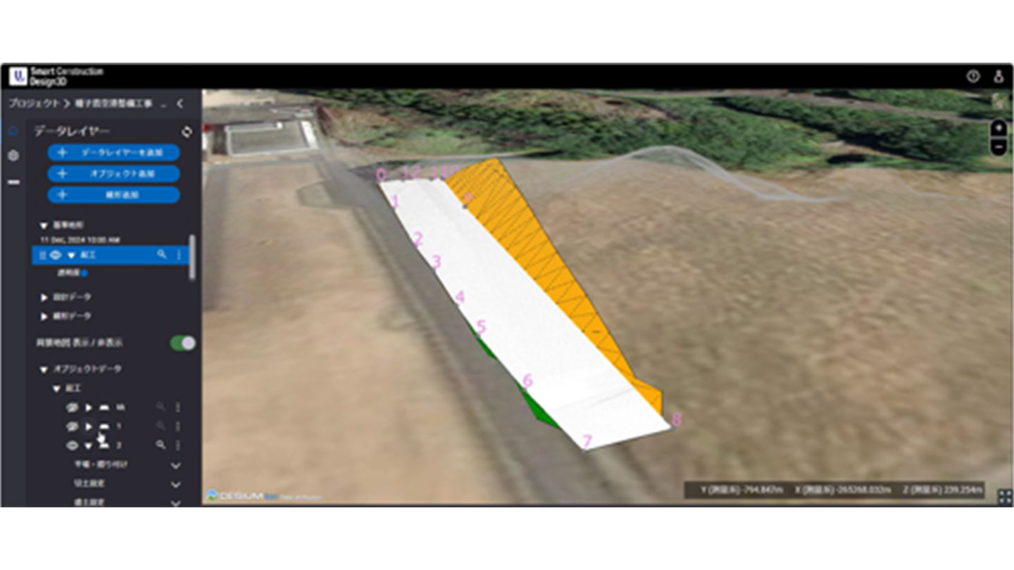 従来は2次元上で想像力を働かせながら行っていた工数がかかる業務も、Smart Construction Design3Dでは驚くほど少ない工数で作図ができ、3次元データを用いることで視覚的にもわかりやすく、発注者との打合せもスムーズに行えました。さらに、作図したデータをPC200マシンガイダンス装着機に転送すると切り出し位置が確認でき、想定より4日ほど早く施工を開始できました。施工管理においては現地で測量して図面に落とし込む作業で1日3時間は必要でしたが、Smart Construction DashboardではPC200マシンガイダンス装着機の施工履歴データが反映されたアプリ上の作業で1日1時間に短縮し、人工が42%削減されました。施工日の進捗がさかのぼって確認できるので、完成検査時にアプリ画面を見せながら進捗状況の説明ができたのも便利でした。