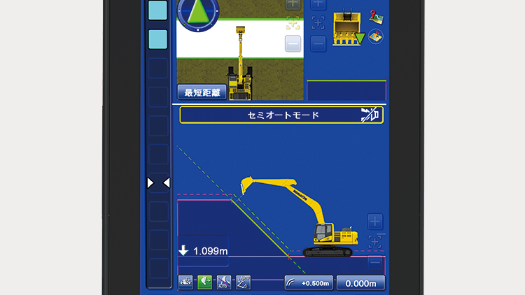 コマツICT油圧ショベルは、GNSS(グローバル衛星測位システム)による位置情報と3Dの設計データ、アーム制御システムにより、作業機操作のセミオート化を実現した世界初のマシンコントロール油圧ショベルです。バケットの刃先が設計面に達すると機械が自動停止するため、オペレータは掘り過ぎを気にすることなく安心して作業を行えます。コントロールボックス(情報化施工専用モニタ)には、見やすく、使いやすい、業界初の12.1インチ大画面を採用。アイコン表示とタッチパネルで簡単に操作できます。