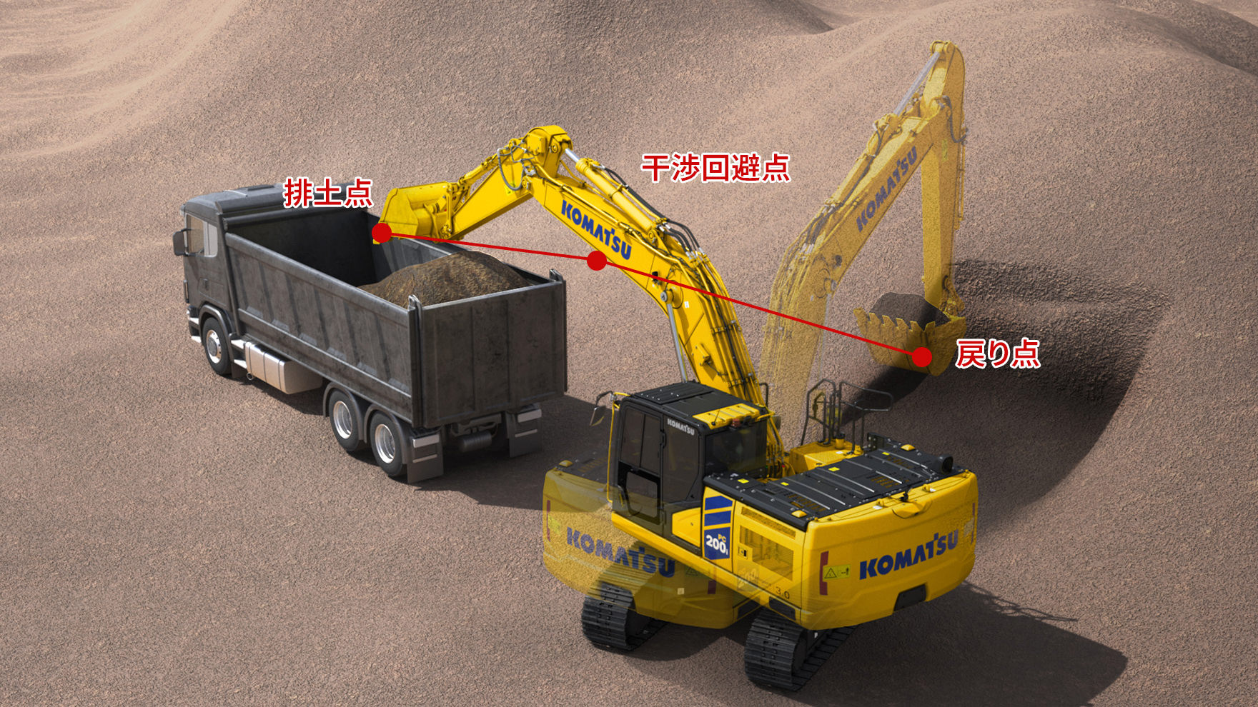 戻り点と排土点、ダンプとの干渉回避点を設定することで旋回を自動で行います。