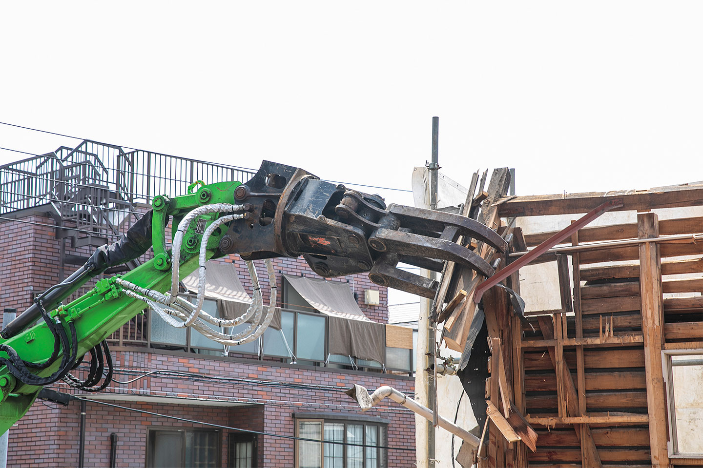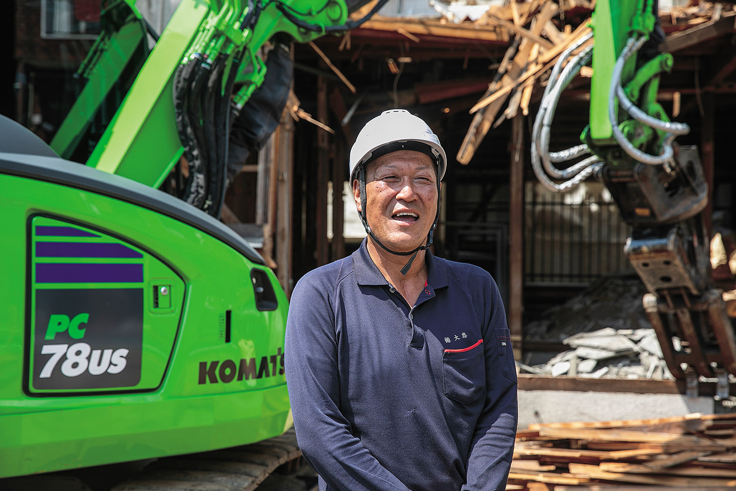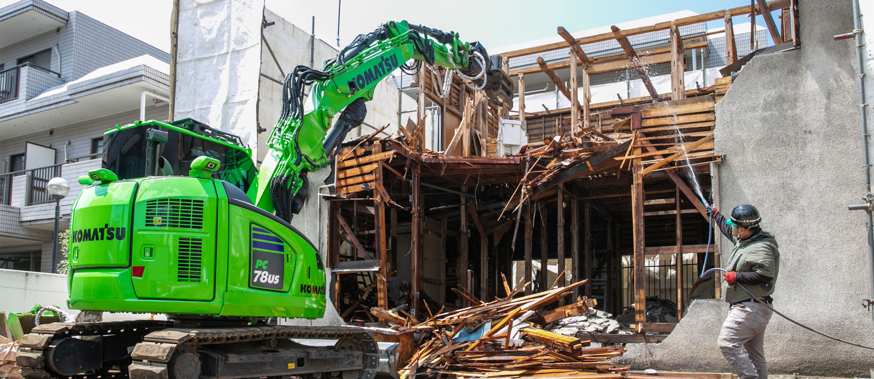 同社が手がける現場は、都内の住宅街の一軒家やアパートなど、二階建て木造住宅の解体が中心だ。周囲に建物が迫る狭小地での作業が多いため、建機には大きなスペースを必要としない小回り性能が強く求められる。そうした環境に対応するため、同社ではこれまでロングアームのPC78US-8解体仕様で解体業務を行っていた。その後、同業者より「ブームを分割構造としている2ピースブームは、狭いスペースでの解体作業に更に力を発揮する」との情報を入手。試乗を行ったうえで、その機能性を実感し、PC78US-11解体2ピースブーム仕様を購入した。