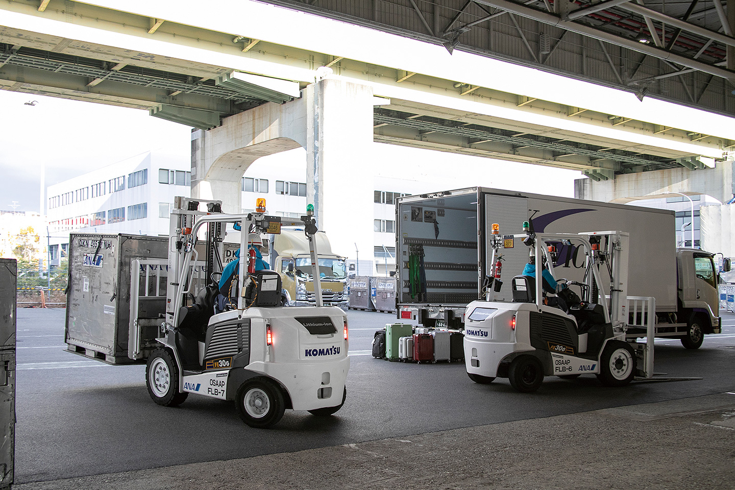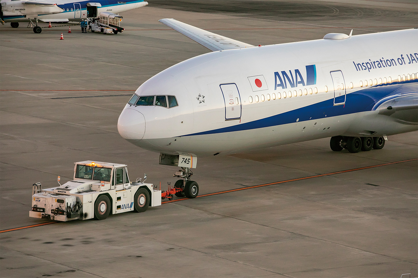 長年にわたり採用されてきたコマツのトーイングトラクターによる航空機の牽引作業