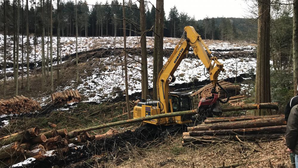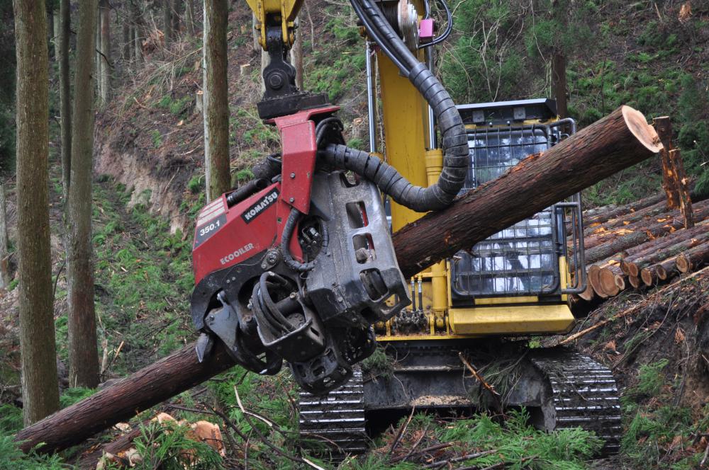 (写真:伐倒された丸太の枝打ちと集材をこなすコマツ製ハーベスタ)