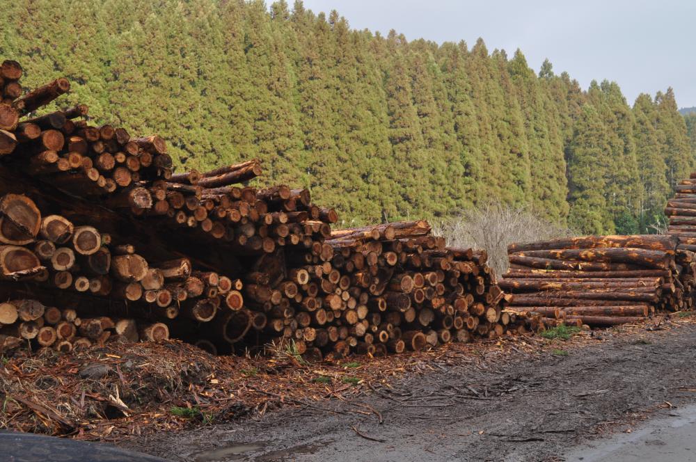 (写真:道路脇に設けられた貯木場には、大型トレーラーによる配送を待つ大量の丸太が積み上げられている)