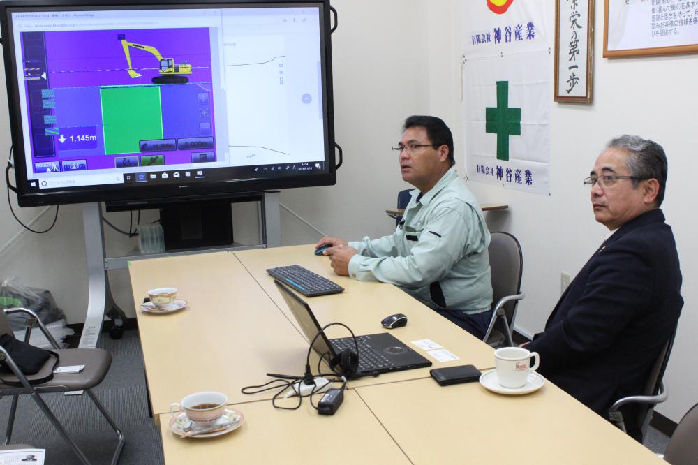 神谷産業は建機だけでなく、会社業務全体にICT技術を取り入れている。例えば測量も通常のトータルステーション(TS)や丁張ではなくドローンやレーザスキャナーを使って測量したデータを3D解析し、2次元の設計図面ではなく3D設計データを活用するなど徹底的にICT化した環境を用意。インターネットに接続できる環境さえあればどこからでも現場の稼働状況を見ることができる。「ICT建機の導入で業務効率は倍近くになりました。とにかく早いんです。初心者や女性オペレータを補助するだけではありません。熟練のオペレータもICT建機を使うと作業が楽になるし、スピードも大幅に向上します」。
