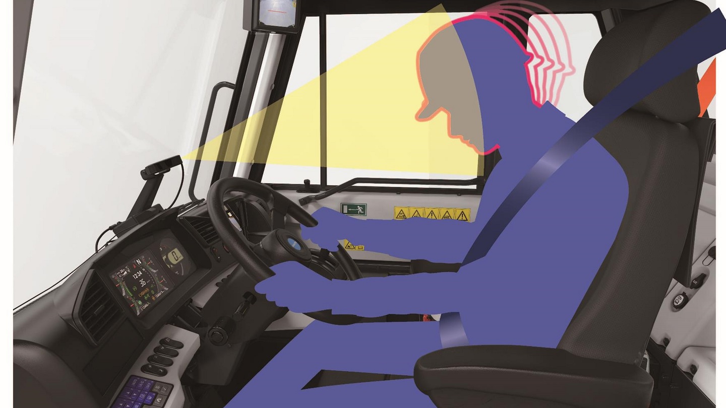ダッシュボード上のカメラによりオペレーターの顔、姿勢を認識し、居眠りなどを検知した場合に音声とブザーでオペレーターに注意を促します。
