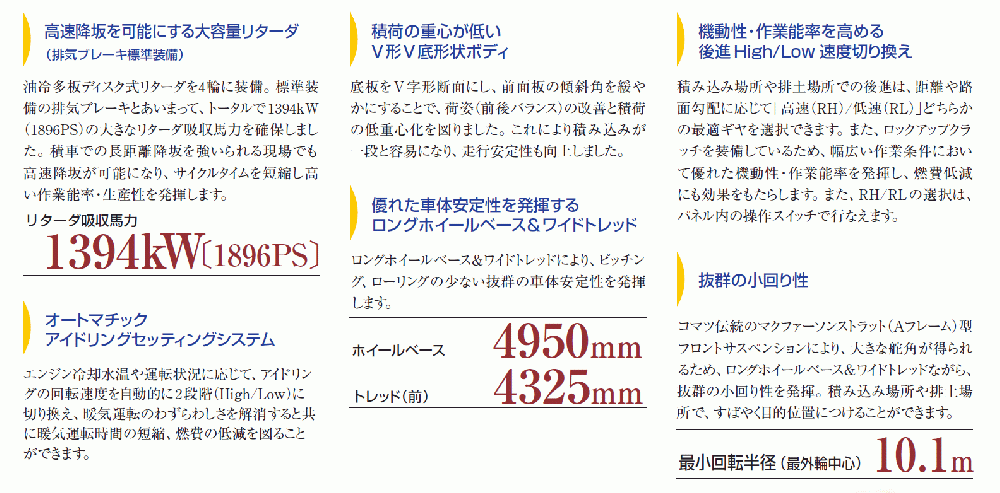 積み込み場所やダンプ場所での後進は、距離や路面勾配に応じて「高速/低速」どちらかの最適ギア(ロックアップ機能付き)を選択できます。幅広い作業条件において優れた機動性・作業能率を発揮し、燃料消費率低減にも効果をもたらします。
