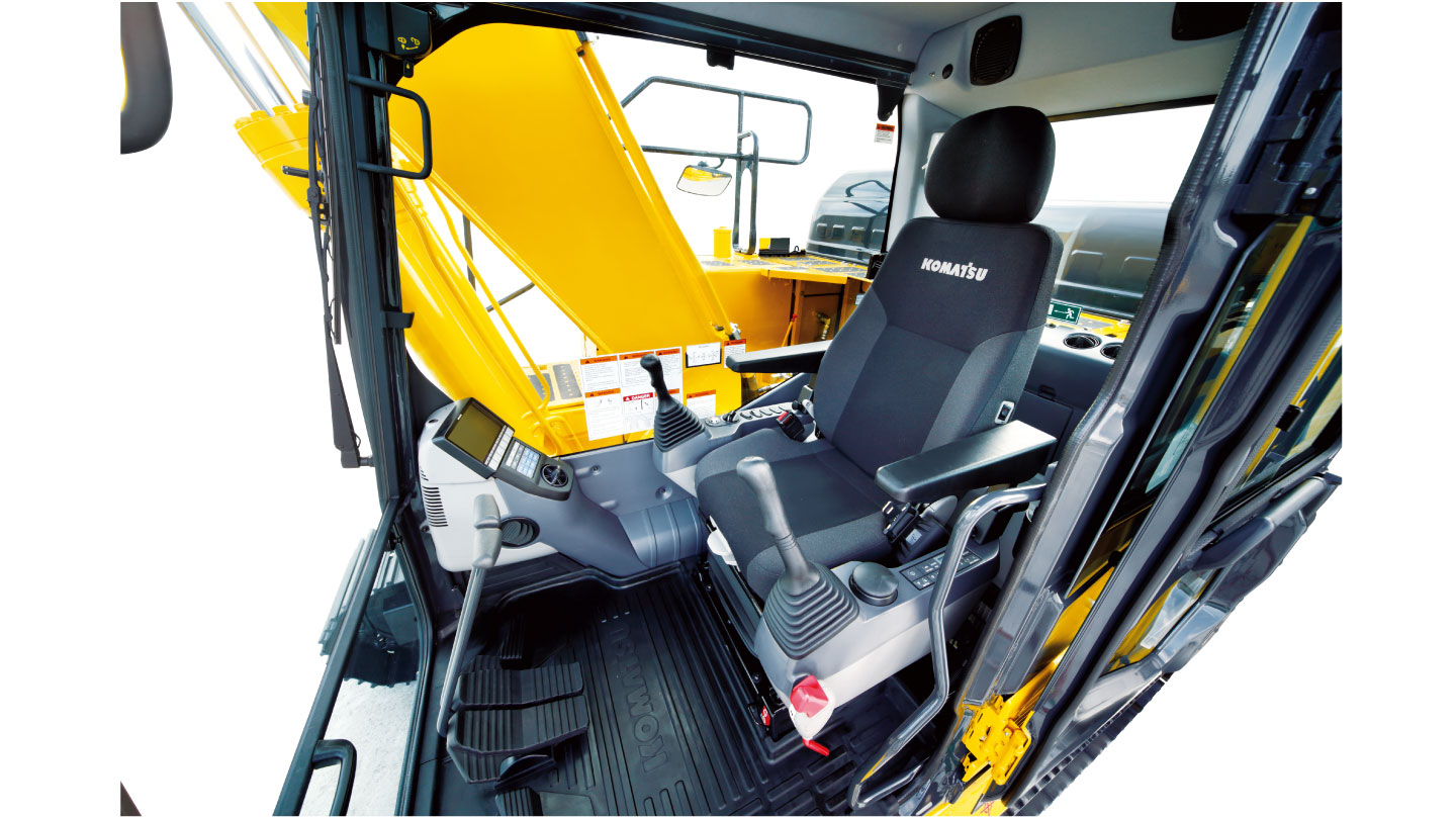 機械周囲カメラシステム(KomVision)を標準装備し、機械周囲をモニタ上で表示することが可能に。ロックレバー自動ロック機能も搭載することで、オペレーターの誤操作を防止します。