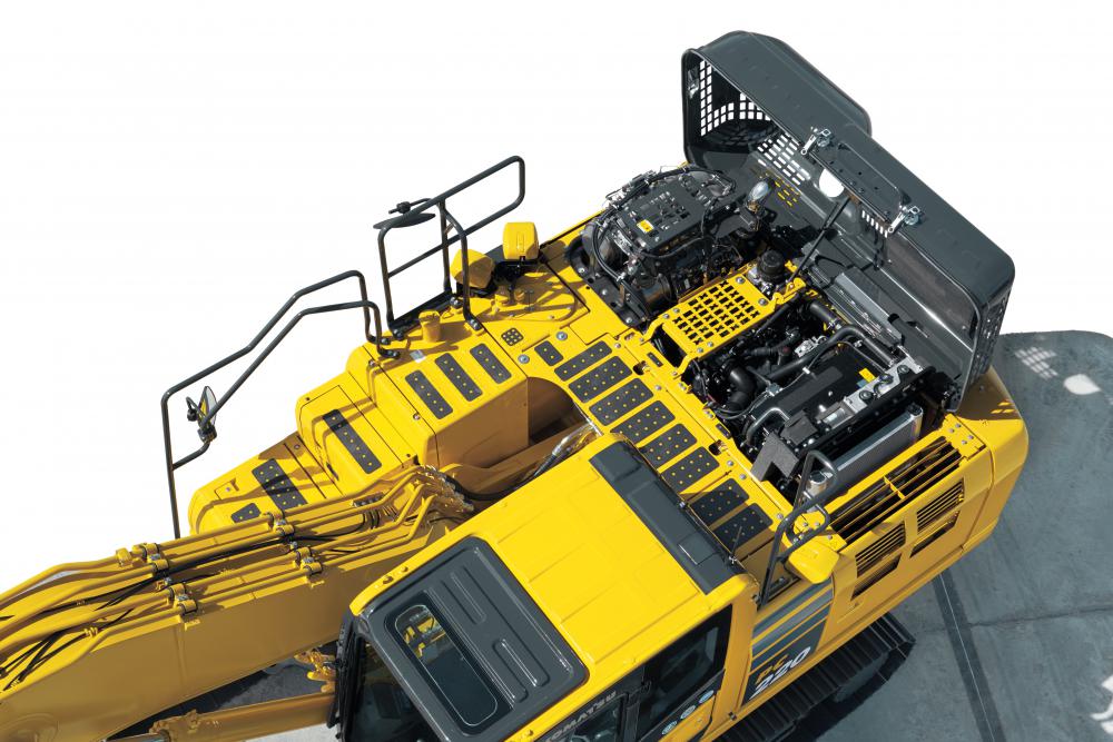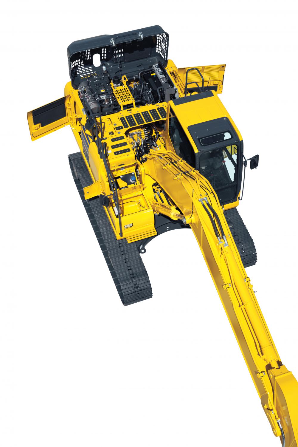 機体の稼働状況に合わせて最適に制御するトータルビークルコントロール(機体総合制御)が更に進化。エンジンと油圧システムの最適制御、油圧回路のロス低減、大容量高効率油圧ポンプや高効率クーリング、およびオートアイドルストップ機能の採用等により、機械ポテンシャルを最大限に引き出しながら時間当たり燃料消費量を従来機に比べて5%低減しました。