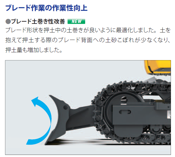 土砂こぼれを低減させる新形状のブレードを採用したことで、押土量を増加させました。また、ミニショベルと同様に走行速度のHi/Loをワンタッチで切り替えられるスイッチをブレードレバー上端に搭載したことで、走行しての作業性を大きく向上させました。さらに、LEDライト、後方モニタシステム、サスペンションシートを標準装備し、安全性や快適性を向上しました。