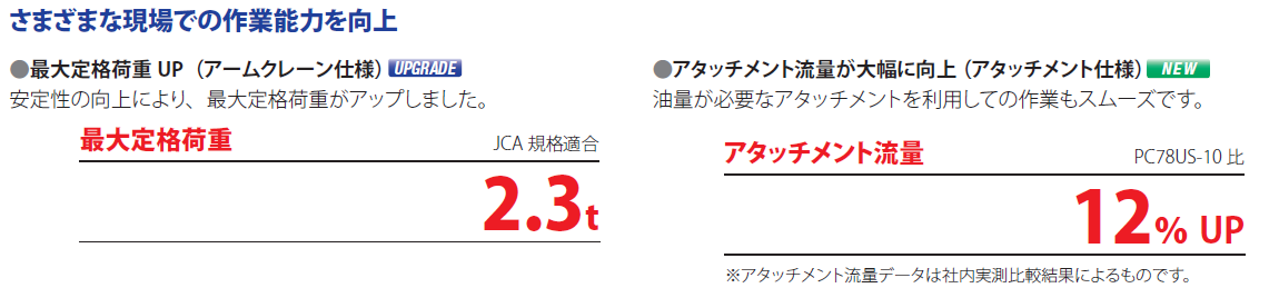 新開発の3気筒2.4L高出力エンジンを携え、基本性や機能を大幅にグレードアップ。従来機に対して作業効率は23%(Pモード90°ダンプ積込作業時)、スキトリ速度は18%向上させました。また、安定性の向上によりアームクレーンの最大定格荷重を従来機の1.7tから2.3tへと大幅にアップしました。アタッチメント流量が12%もアップしており、アタッチメント使用時の作業をより円滑に進めることが可能に。