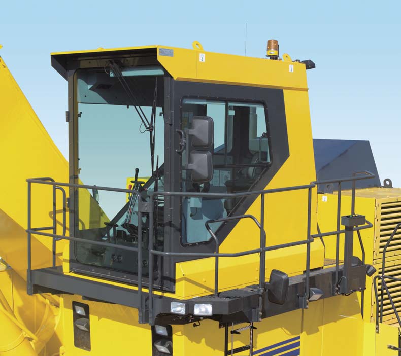 マイニングショベル専用に開発した先進の大型キャブは、フロア下まで延長した大きなガラスエリアにより視界性抜群。従来と比べ容積が30%も広くなり、安全で快適な作業空間を提供します。また、剛性の高いモノフレームキャブと新型マウントとともに、騒音の元となるエンジン、冷却ファン、油圧ポンプなどをまとめて格納し、吸音ブレードで遮音したことで、驚異の低騒音を実現しました。